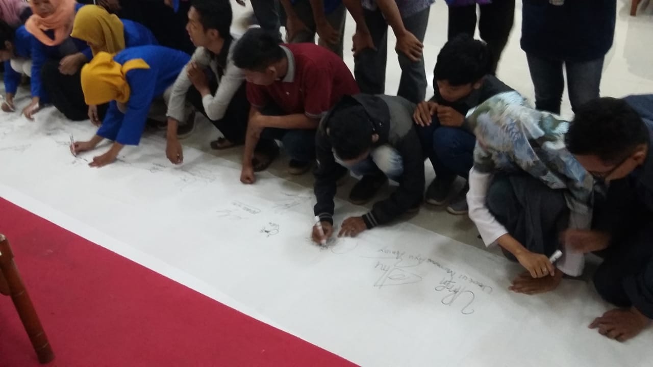 Usai sosialisasi empat pilar, mahasiswa dan dosen Universitas Pekalongan (Unikal) membubuhkan tanda tangan pada kain panjang deklarasi menolak radikalisme.