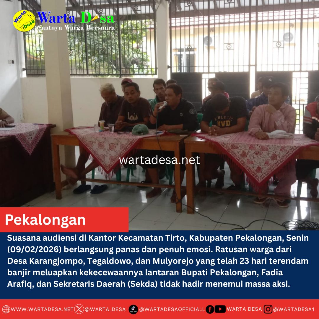 PEKALONGAN, Warta Desa – Suasana audiensi di Kantor Kecamatan Tirto, Kabupaten Pekalongan, Senin (09/02/2026) berlangsung panas dan penuh emosi. Ratusan warga dari Desa Karangjompo, Tegaldowo, dan Mulyorejo yang telah 23 hari terendam banjir meluapkan kekecewaannya lantaran Bupati Pekalongan, Fadia Arafiq, dan Sekretaris Daerah (Sekda) tidak hadir menemui massa aksi.