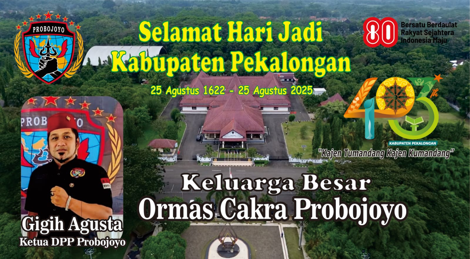Warta Desa, 25 Agustus 2025 – Dalam rangka memperingati Hari Jadi Kabupaten Pekalongan ke-403, Cakra Probojoyo Kabupaten Pekalongan menyampaikan ucapan selamat dan sukses kepada seluruh masyarakat Kabupaten Pekalongan. Peringatan ini menjadi momentum penting untuk memperkuat semangat kebersamaan dan komitmen membangun daerah yang kita cintai bersama.