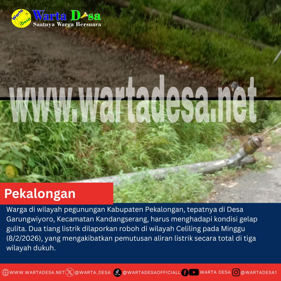 WARTA DESA, KANDANGSERANG, PEKALONGAN – Warga di wilayah pegunungan Kabupaten Pekalongan, tepatnya di Desa Garungwiyoro, Kecamatan Kandangserang, harus menghadapi kondisi gelap gulita. Dua tiang listrik dilaporkan roboh di wilayah Celiling pada Minggu (8/2/2026), yang mengakibatkan pemutusan aliran listrik secara total di tiga wilayah dukuh.