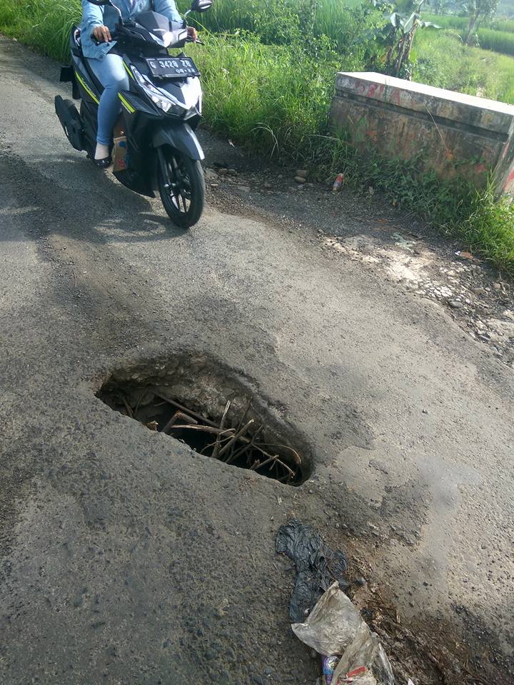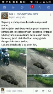 “Saya ingin melaporkan kepada masyarakat umum, Bahwa jalan arah Doro-kedungwuni tepatnya perbatasan kutosari dengankaliketing terdapat lubang yang cukup dalam, saya sudah sering liat orang jatuh disini bahkan ada yg jatuh dengan luka amat serius, Lubang sudah ada 6 bulanan lur,” tulis Eko.