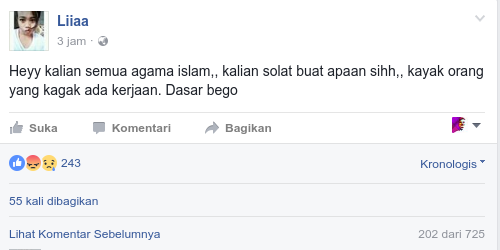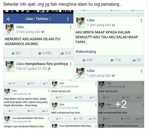 Dalam akunnya, Liiaa memposting bernada provokasi menghina pemeluk agama dengan postingan “Heyy kalian semua agama islam,, kalian solat buat apaan sihh,, kayak orang yang kagak ada kerjaan. Dasar bego” Tulisnya di akunnya, Selasa (14/2) pukul 16.50 WIB.