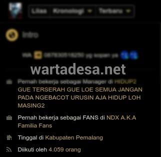 Pemalang, Wartadesa. – Akun media sosial ‘FB’ bernama Liiaa dengan alamat akun https://www.facebook.com/Liiaa-609829212548246/?fref=ts dan di https://www.facebook.com/profile.php?id=100010818228727 membuat resah warga Pemalang. Demikian dilansir dalam sebuah posting grub ‘Pusat Berita Pemalang’, Selasa (14/2).