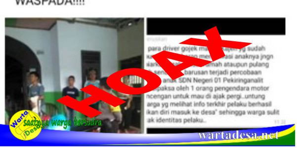 Kajen, Wartadesa. – Kabar adanya percobaan penculikan anak SD sempat membuat resah warga Kecamatan Kajen Kabupaten Pekalongan. Terkait hal itu pihak Kepolisian baik dari Polres Pekalongan dan Polsek Kajen sendiri telah mengecek seluruh sumber informasi yang disebutkan dalam media sosial (medsos) tentang informasi percobaan penculikan terhadap siswa kelas 2 SD Negeri 1 Pekiringanalit Kecamatan Kajen Kabupaten Pekalongan. Dan dari hasil penyelidikan, Polisi memastikan bahwa info dan berita tersebut adalah hoaks (hoax).