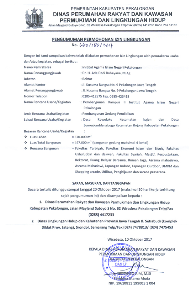 Kajen, Wartadesa. – Pengajuan ijin lingkungan secara tertulis pendirian Kampus Institut Agama Islam Negeri (IAIN) Pekalongan ditunggu paling lambat hingga 20 Oktober 2017. Demikian isi pengumuman yang dimuat dalam laman website resmi Pemerintah Kabupaten Pekalongan, hari ini, Rabu (11/10).