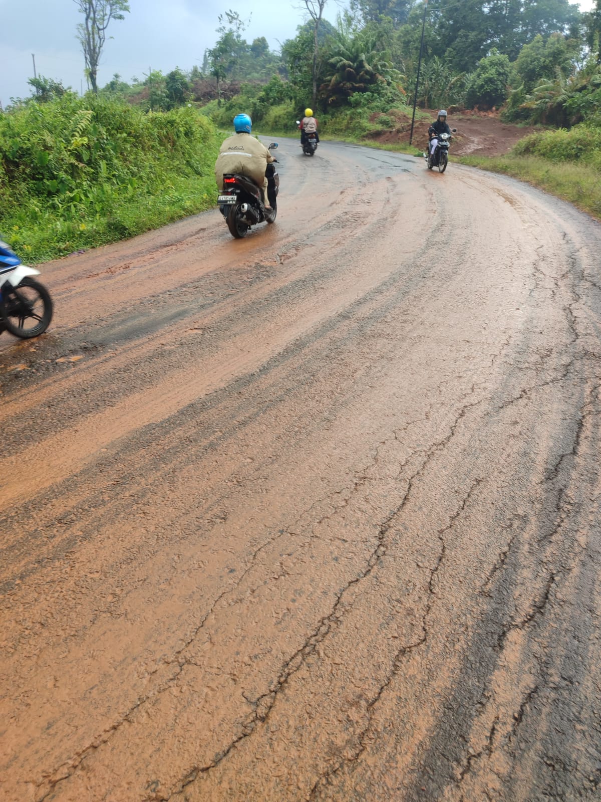 Tanah merah dari kendaraan pengangkut kayu yang melintas diduga tercecer ke badan jalan, sehingga ketika hujan turun, permukaan jalan menjadi licin seperti berlumpur. Kondisi ini membuat banyak pengendara, terutama sepeda motor, rawan tergelincir saat melintas.