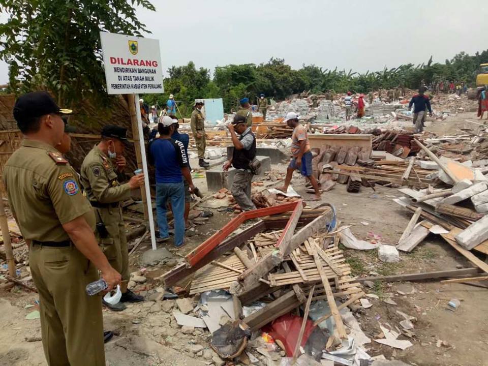 Pemalang, Wartadesa. – Setelah beberapa waktu lalu lokalisasi Calam, tepatnya warung di blok Siwareng Kelurahan Pelutan, sebelah Utara terminal Pemalang yang sering digunakan untuk tempat mangkal pekerja seks komersial (PSK) disegel. Kini 31 bangunan liar berupa warung sepanjang jalan tersebut kini rata dengan tanah.