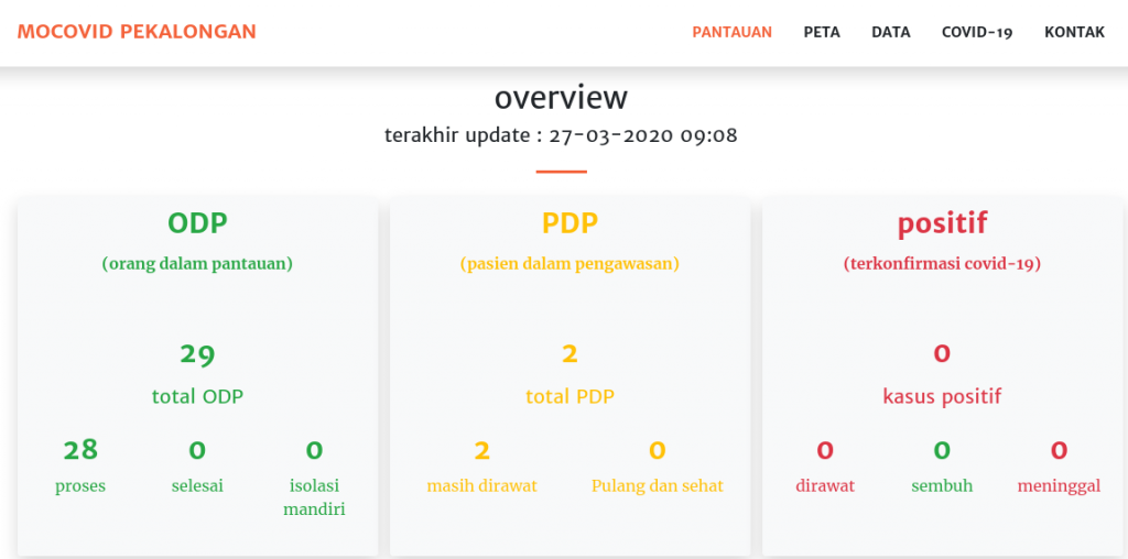 Kajen, Wartadesa. – Data Orang Dalam Pemantauan (ODP) Covid-19 di Kota Santri hampir merata di seluruh kecamatan. Data diambil dari laman http://corona.pekalongankab.go.id/ hingga hari ini, Jum’at (27/03), sebanyak 29 orang masuk ODP (28 dalam proses ODP), dua orang PDP dirawat di RSUD Kajen dan nihil positif Corona.