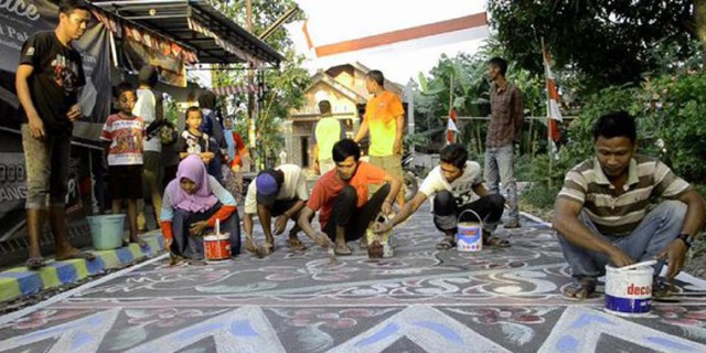 “Ini sudah kelima kalinya. Ini untuk meramaikan tujuh belasan. Seluruh kampung dukuh Sembung dicat, sekitar 1 kilometer. Warga membatik jalan karena kebanyakan jadi pembuat batik,” tambah Fathoni (38).