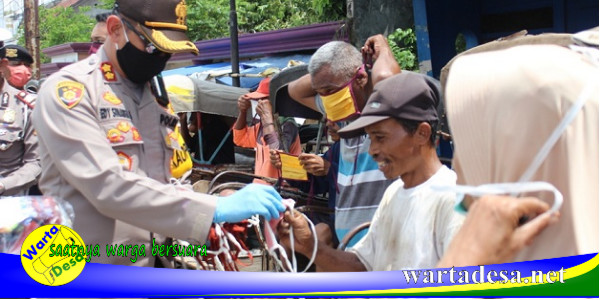 Pemalang, Wartadesa. – Ditengah wabah Korona (Covid-19), jajaran Polres Pemalang, dipimpin Kapolres, AKBP Edy Suranta Sitepu, membagikan 600 masker kain dan paket sembako, serta leaflet Operasi Keselamatan Lalu Lintas Candi (OKLC), Selasa (07/04).