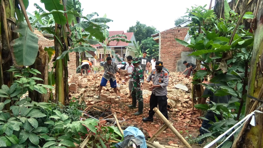 Warga bersama aparat TNI/Polri membersihkan puing-puing reruntuhan rumah. Kerugian material saat ini masih dihitung. (Bono)