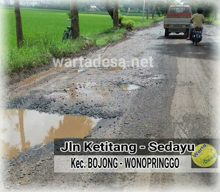 Bojong, Wartadesa. – Kerusakan Jalan Raya Ketitang (Bojong) – Sedayu (Wonopronggo) dibeberapa titik dikeluhkan warga, musim penghujan menambah kondisi jalan mengkhawatirkan. Salah satu warga pengguna jalan asal Desa Menjangan Kecamatan Bojong Kabupaten Pekalongan, Jawa Tengah, Hadi Isnanto mengatakan, Kerusakan jalan tersebut sudah sangat lama.