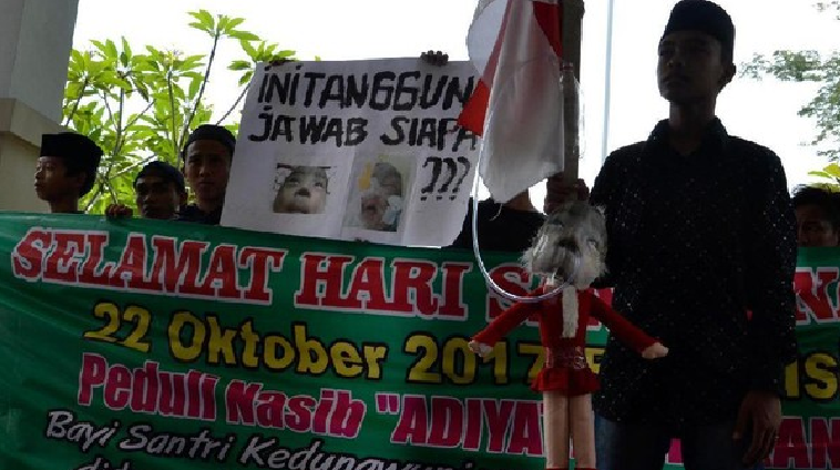 Para santri membawa spanduk bertuliskan ‘Selamat Hari Santri Nasional 22 Oktober 2017 Resolusi Jihad, Peduli Nasib Adiyatma Erkan Altaya, Bayi santri Kedungwuni yang mengalami cacat hidung diduga akibat kelalaian oknum dokter RSUD Kajen’.