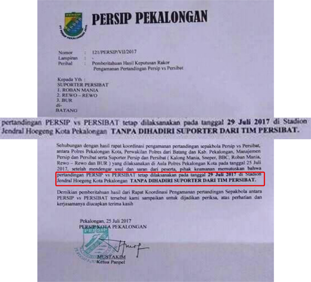 Dalam surat itu dijabarkan bahwa keputusan dari panpel Persip Pekalongan terkesan sepihak lantaran suporter dari Persibat justru dilarang hadir dalam laga pertandingan sepakbola di Stadion Hoegeng Pekalongan.