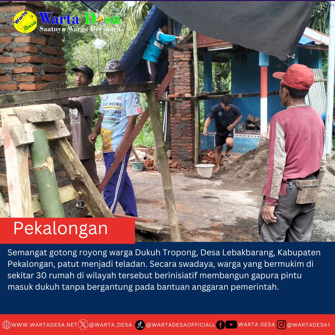 LEBAKBARANG,WARTA DESA – Semangat gotong royong warga Dukuh Tropong, Desa Lebakbarang, Kabupaten Pekalongan, patut menjadi teladan. Secara swadaya, warga yang bermukim di sekitar 30 rumah di wilayah tersebut berinisiatif membangun gapura pintu masuk dukuh tanpa bergantung pada bantuan anggaran pemerintah.