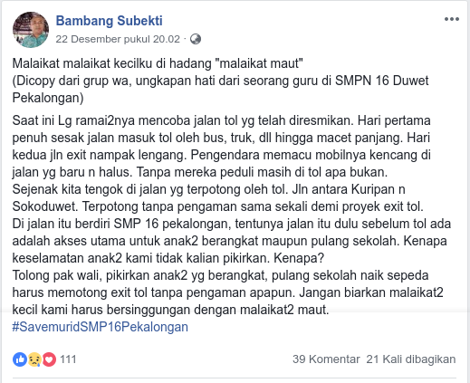 Di jalan itu berdiri SMP 16 pekalongan, tentunya jalan itu dulu sebelum tol ada adalah akses utama untuk anak2 berangkat maupun pulang sekolah. Kenapa keselamatan anak2 kami tidak kalian pikirkan. Kenapa?